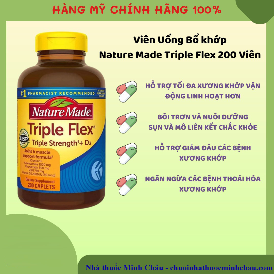 Trong bài viết này, chúng tôi sẽ cung cấp cho bạn những thông tin chi tiết về NATURE MADE TRIPLE FLEX TRIPLE STRENGTH 50 CHAI 120 VIÊN, từ công dụng, thành phần, hướng dẫn sử dụng, lợi ích và đánh giá của khách hàng. Chúng tôi cũng sẽ chỉ ra nơi mua sản phẩm chính hãng để bạn có thể yên tâm sử dụng. Hãy cùng dược sĩ nhà thuốc Minh Châu tìm hiểu thêm về sản phẩm này trong bài viết dưới đây.